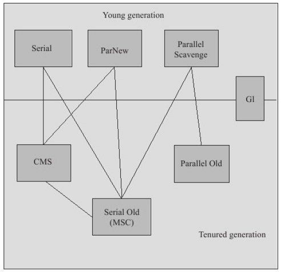 搭配组合使用于整个堆内存的回收,可搭配的方式如图: