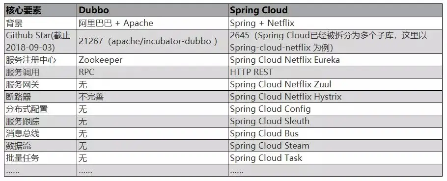 对比Dubbo 和Spring Cloud 可以发现,Dubbo 只是实现了服务治理,而Spring Cloud 的子项目则分别覆盖了微服务架构下的众多组件,而服务治理只是其中的一个方面。