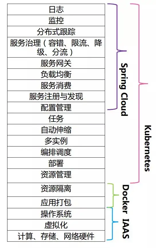 综上对比,K8s 遵循了微服务架构的基本核心要素,虽然在一些功能上有所欠缺,但不可否认,K8s 帮助补足了使用Spring Cloud 所缺失的一部分。