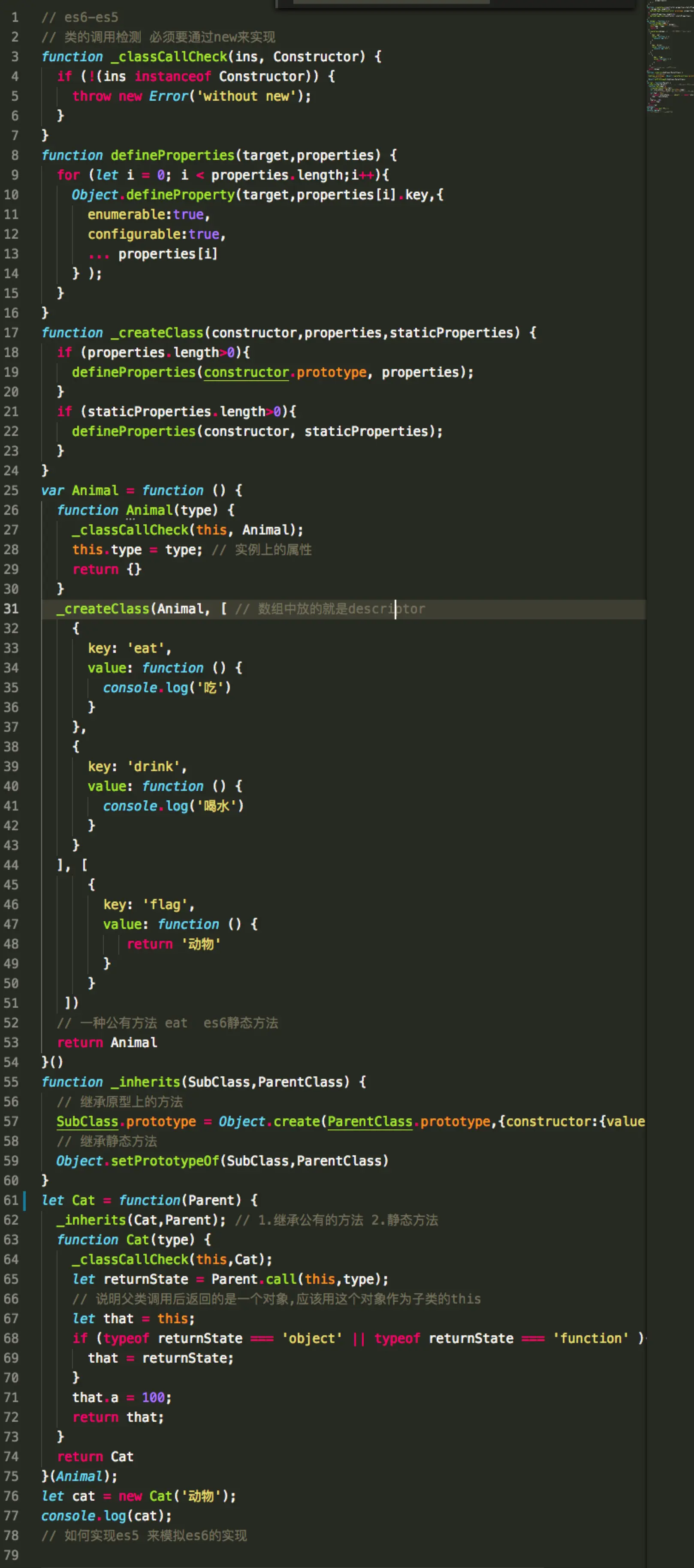 那么class是用es5,怎么实现出来的呢?上代码: