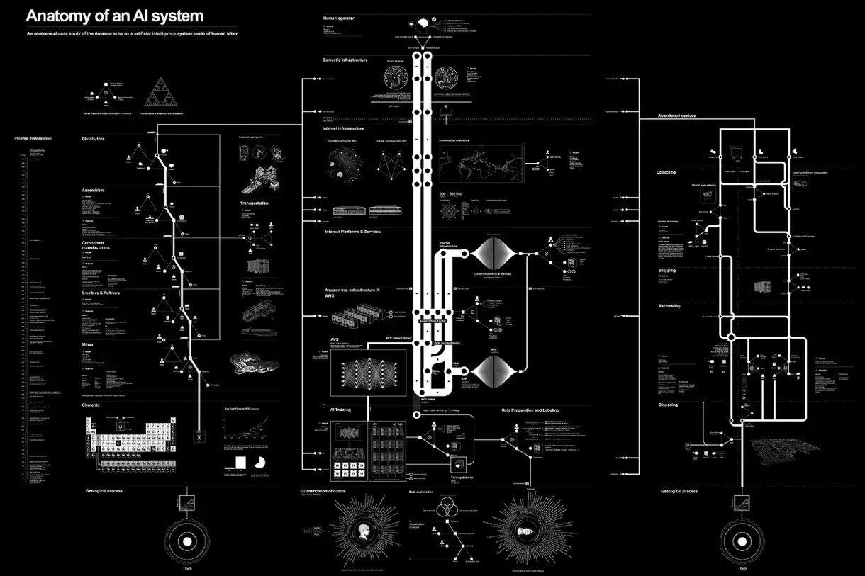 它是一堆乱七八糟的黑色和白色的分支线,看起来更像核反应堆的原理图而不是日常的小工具。该全景图被称为人工智能系统解剖图,但其副标题解释了其讨论的范围:“亚马逊Echo作为人类劳动力、知识与数据和行星上的资源结合产物的解剖图。”