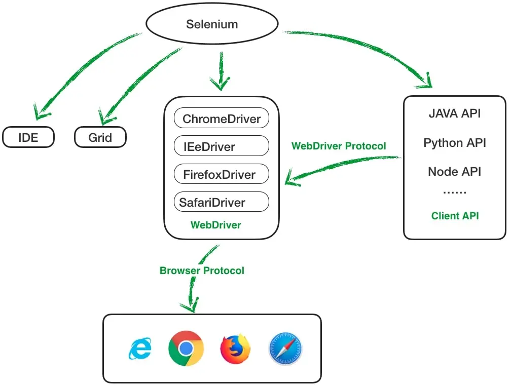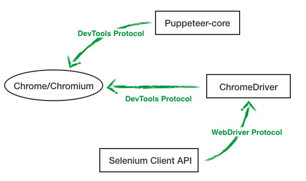 实际上,WebDriver 是 Selenium 根据不同的浏览器(Chrome、Safari、IE、Firefox)的接口定制的规范统称,面对不同浏览器,使用的 Driver 不同,官网目前提供了 IE Driver、Safari Driver、Chrome Driver、Firefox Driver,可以通过下图加深理解,以 Chrome 为例,Puppeteer-core 和 ChromeDriver 都是通过 devtools-protocol 控制浏览器,区别是 Puppeteer-core 是开发者直接可用的 Node 库,ChromeDriver 则需要用户通过 Selenium Client API 进行调用