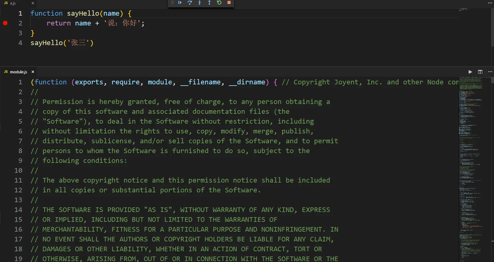 我们先写一段简单的代码,在node环境下运行,来看看commonJS是如何处理的: