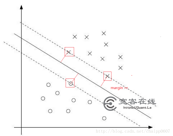 上图中红色的线就是要优化的目标,它表征了数据到决策边界的距离,这个距离就是所谓的最大分类间隔。同时在上面的几个数据,如果靠近两侧的数据少了几个,也不会影响决策边界的确定,而被红色框框出来三个数据才决定了最终的决策边界,所以这三个数据被称之为支持向量。