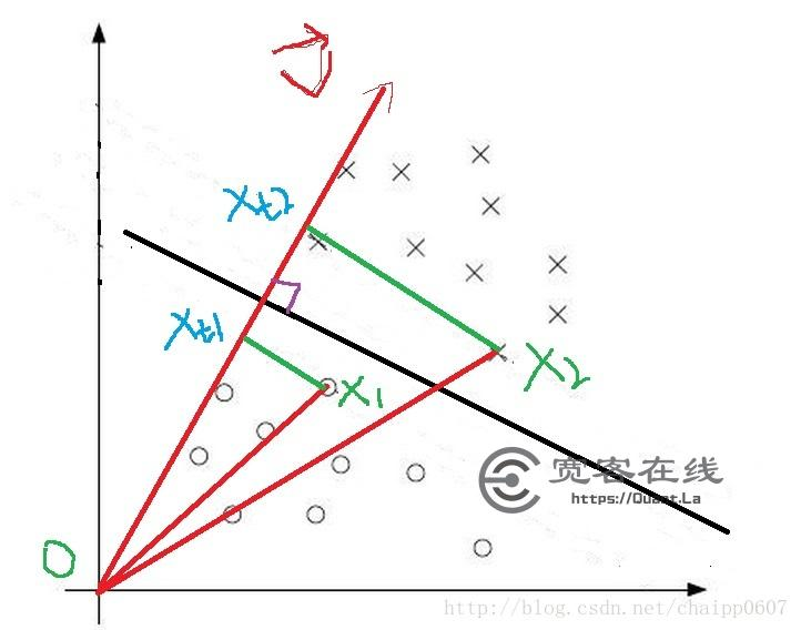 黑色的线是假设的决策边界,X1和X2是决策边界两侧的两个点,Xt1和Xt2是两个点在法向量V上面的投影,那么可以很直观看到,原点到Xt1的距离<原点到Xt2的距离,而且可以推广延伸到只要数据点在决策边界的两侧,那么在决策边界左侧的数据点在法向量上面的投影距离永远比右侧的距离短,这就是支持向量机实现分类预测的依据。那么怎么用公式表征出这个点到直线投影的距离呢? 可以做这样一个假设验证一下: