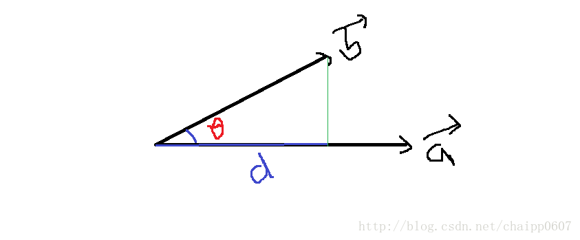 如上图中的情况所示:要求向量b在向量a上的投影距离d,向量的内积可以表示为: