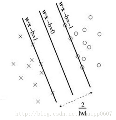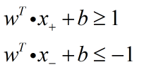 这里的正负1就体现的最大分类间隔,这里是选择用正负1是为了计算方便,因为无论间隔是多少,都可以依靠伸缩w和b约为1。上述公式就是SVM的最大间隔假设。如下图: