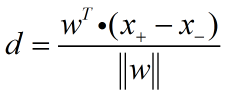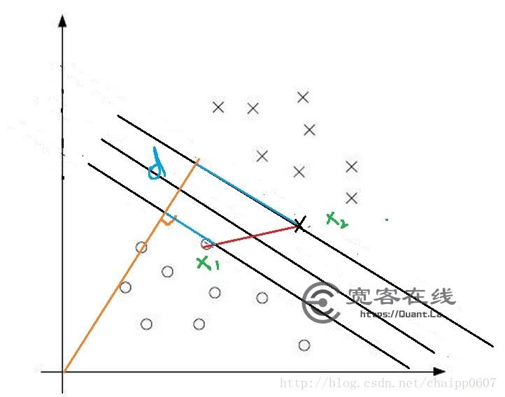 它是这样求出来的,数据中的支持向量在影响着最大间隔,那么假设两个支持向量x1和x2分别为正负,最大间隔就应该是x2-x1在法向量上的投影: