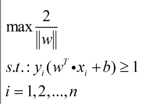 这就是SVM的优化目标,它想要找到max(d),然后大家可能发现了,这个目标里面没有b,之和w有关,那么是不是任意的b都可以呢? 显然不是的,这个优化有一个约束条件,因为推导的过程就有假设条件是两个支持向量要求在两侧,所以这个约束条件可以写成: