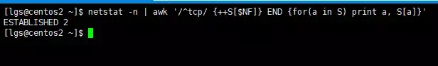 netstat -n | awk '/^tcp/ {++S[$NF]} END {for(a in S) print a, S[a]}'