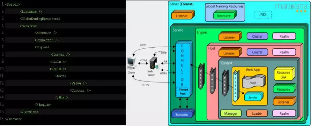 •connector:连接器组件,可以配置多个连接器支持多种协议,如http,APJ 等
