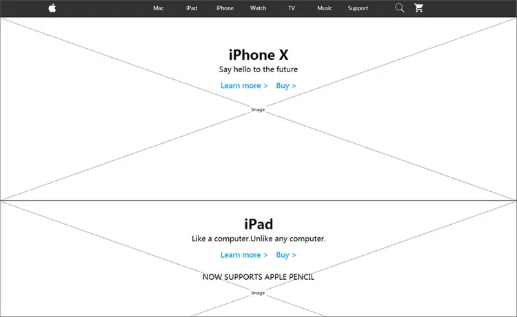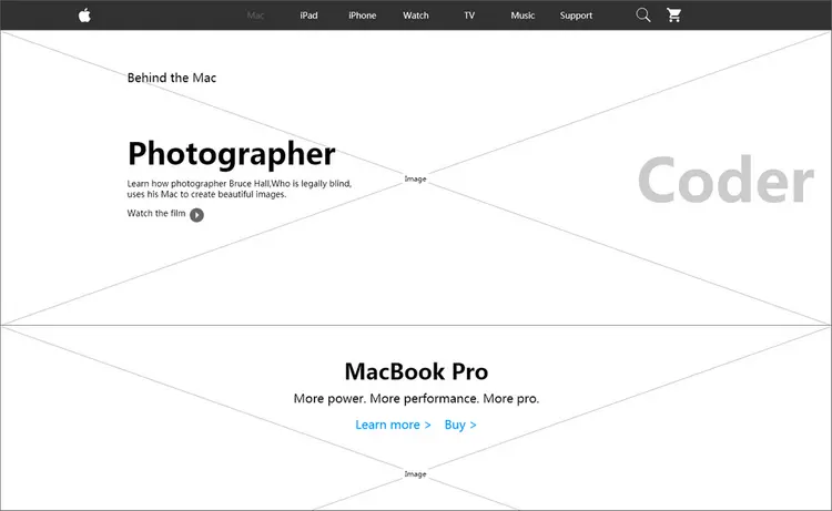 此原型正是取自苹果公司官网,网站主要以展示产品为主,排版方式采用大图配简练的文字,清爽简洁的同时突出产品优势,增大产品的魅力值。本网站采用二次导航的交互方式,配上简练的图文排版方式呈现了苹果数款产品。