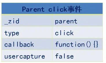 捕获结束后,开始执行冒泡的事件,循环由后向前,开始是child的click事件,但是此时child的_zid大于target的_zid所以继续循环