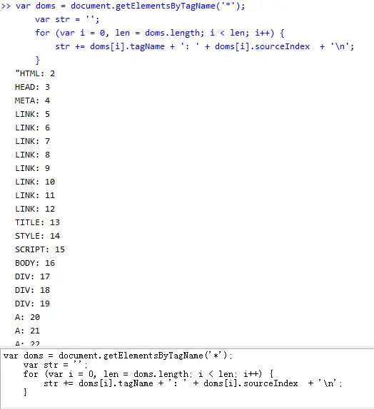 4 str += doms[i].tagName + ': ' + doms[i].sourceIndex + '\n';