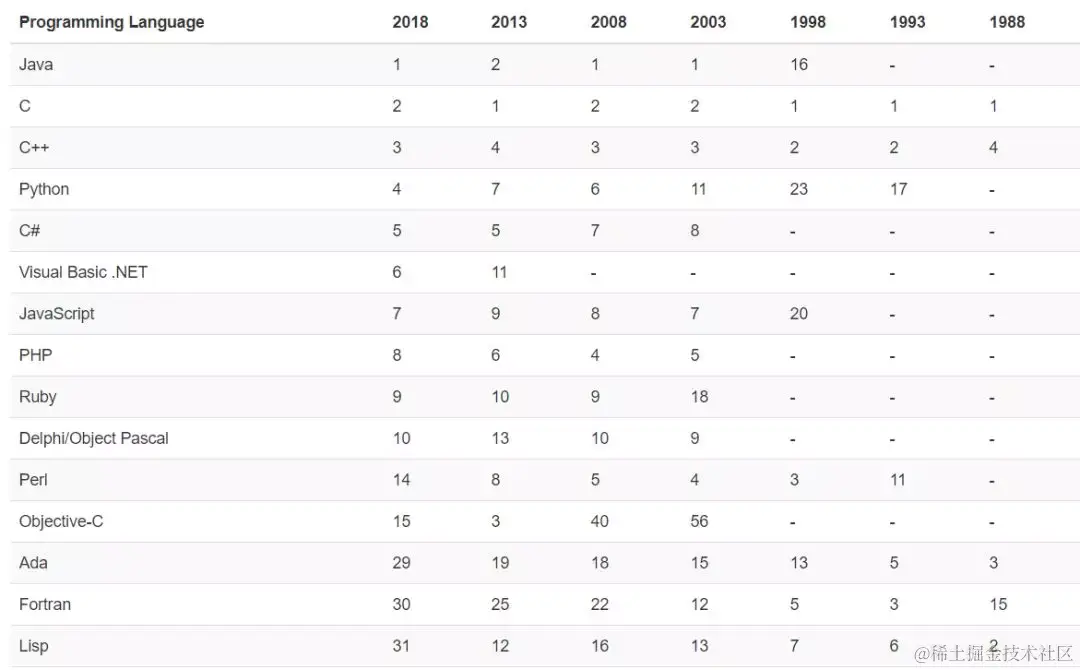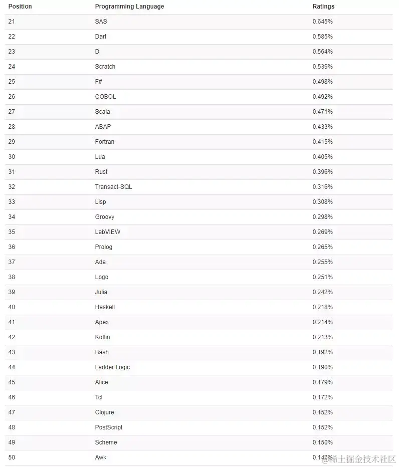 榜单前 10 中需要注意的是,SQL 自 2018 年 2 月起被重新添加到了 TIOBE 排行榜中,由于没有以往的数据可以对比,所以会给人 SQL 语言指数突然暴涨的错觉。