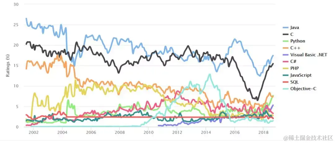 Top 10 编程语言 TIOBE 指数走势(2002-2018)