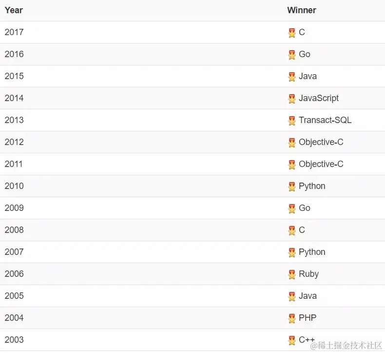 历届“年度编程语言”获奖名单如下图所示,该奖项授予一年中评分最高的编程语言:
