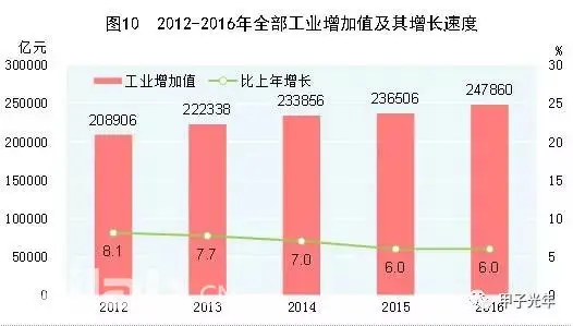 2016年,我国工业增加值达247860亿元,占GDP三分之一以上;全国规模以上工业企业(年主营业务收入在2000万元以上)接近40万家,利润总额达68803.2亿元。