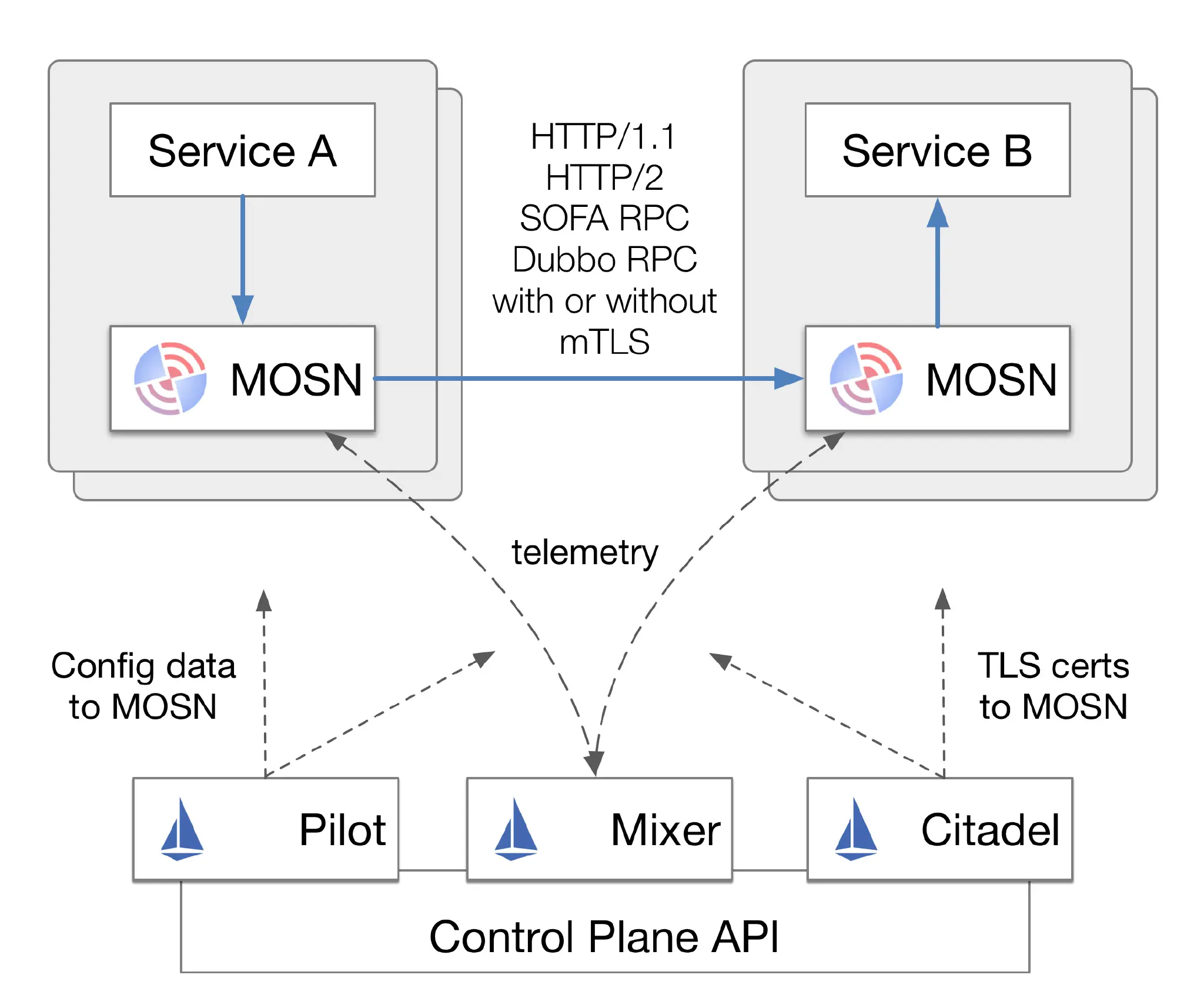 例如下图 SOFAMesh & SOFA MOSN—基于Istio构建的用于应对大规模流量的Service Mesh解决方案的架构图中描述的,MOSN 作为 Sidecar 的方式和应用运行在同一个 Pod 中,拦截所有进出应用容器的流量,SOFAMesh 兼容 Istio,其中使用 Go 语言开发的 SOFAMosn 替换了 Envoy。