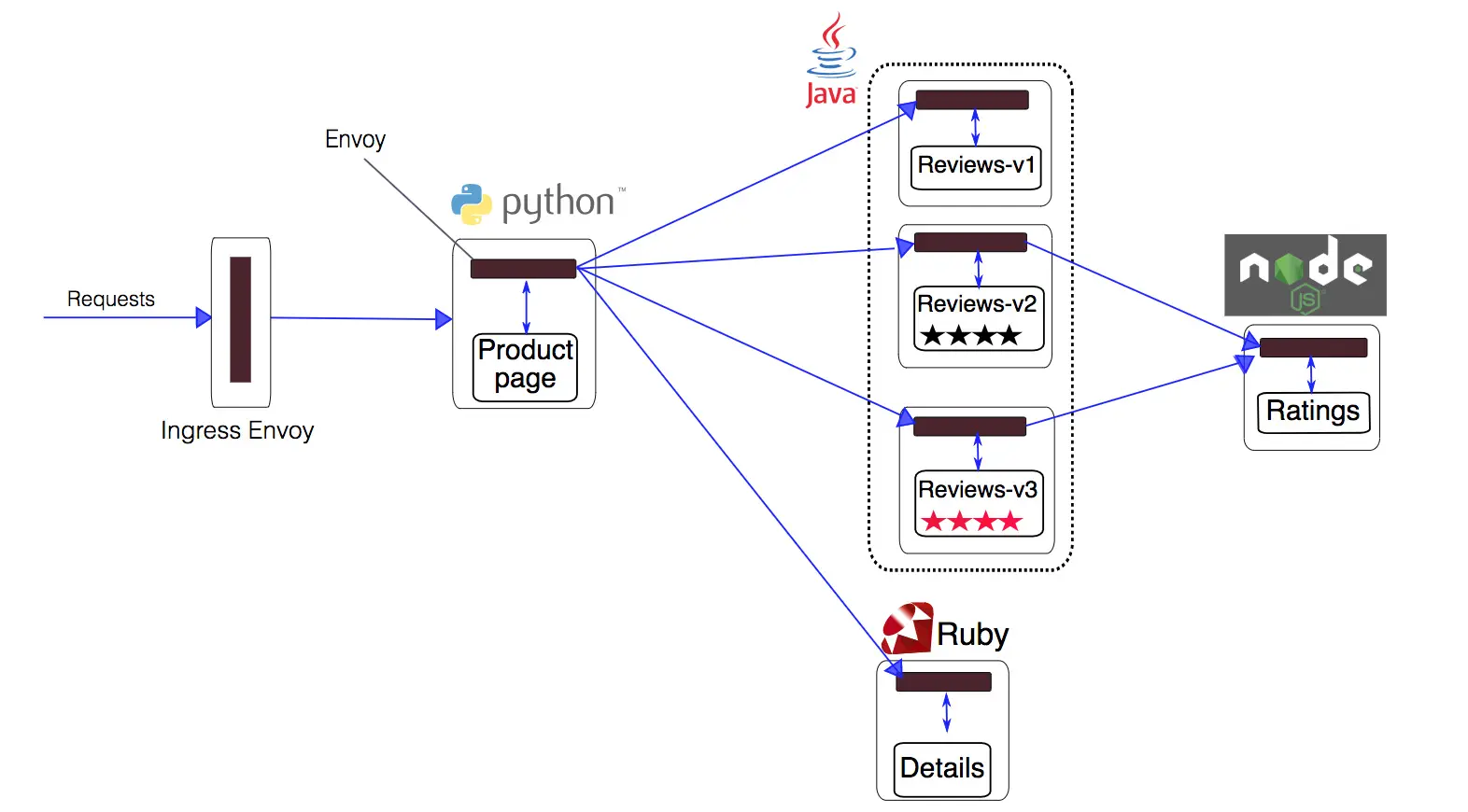 }下图是使用 Istio 管理的 bookinfo 示例的访问请求路径图。
