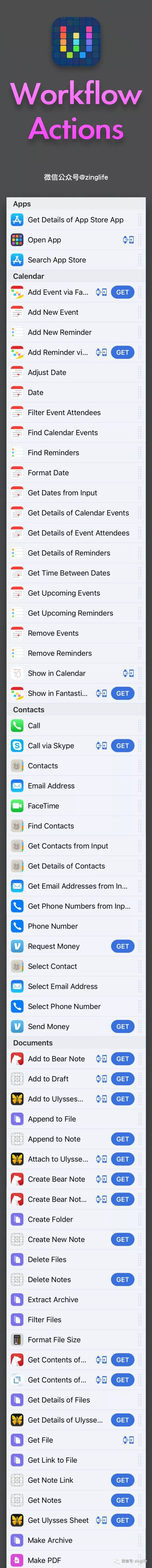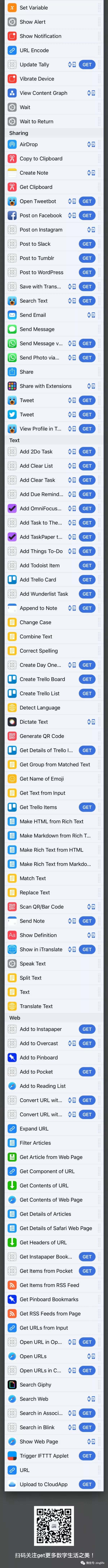我独家制作了「Workflow Action」大全 ,我们可以看图全面了解一下 Workflow 的能力: