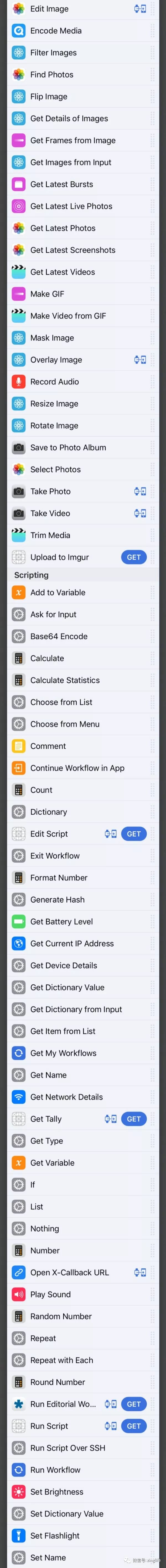 Workflow 集成了大量的「Action」,从「搜索 App Store」到「制作 gif 动画」,还有网络请求等等。