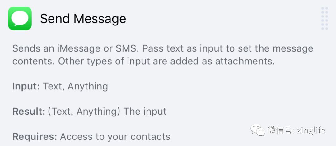 「发送短信」这个 action 接收一段本文(Text)或者任意其他类型,同时把输入继续传给下一个 action。