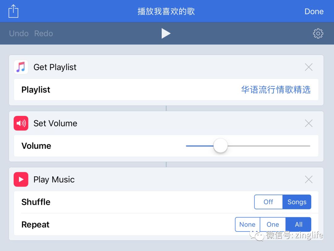 因为 Workflow 只能支持系统自带的「音乐」(Apple Music)所以这里只能以此举例……
