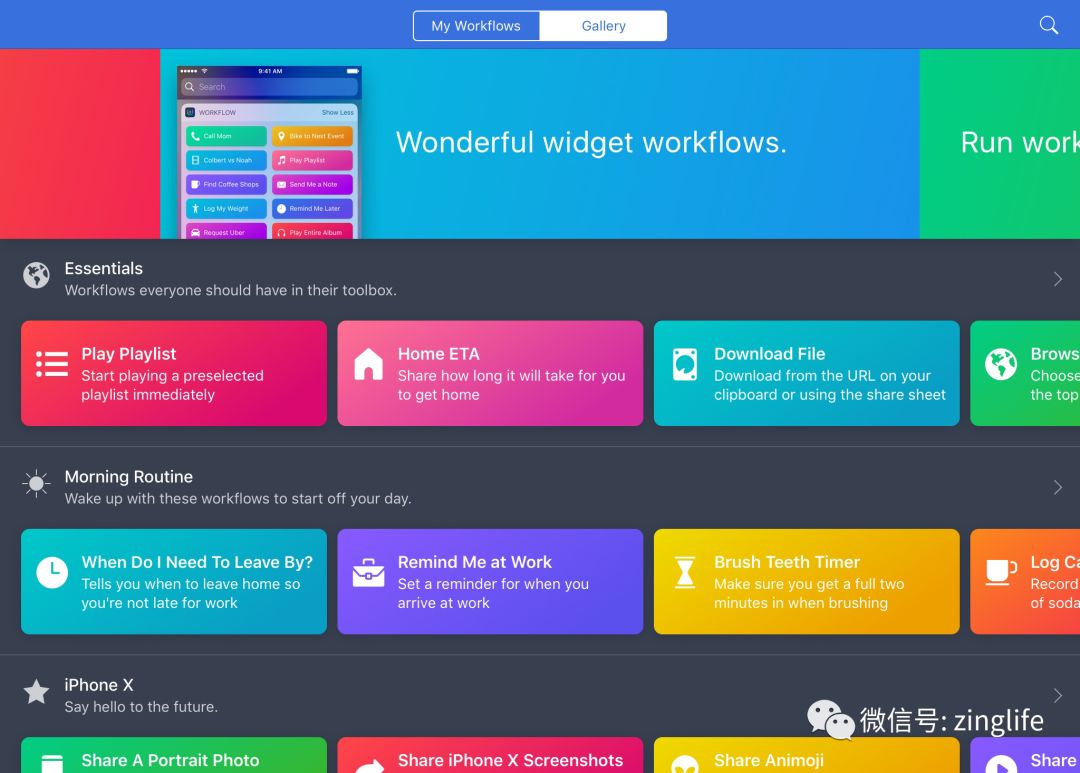 点击旁边「Gallery」则可以浏览到更多预先设计好的「Workflow」,后面我们还会聊到其中一些有趣的设计。