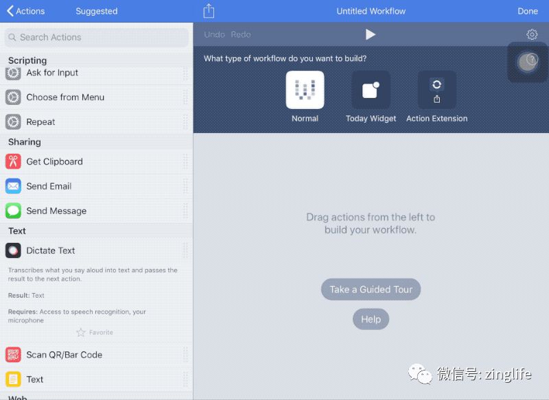 除了 iPhone 因为屏幕较小,所以将 Action 列表和 workflow 分为了两屏之外(支持左右滑动切换),编辑 workflow 的操作都一样。