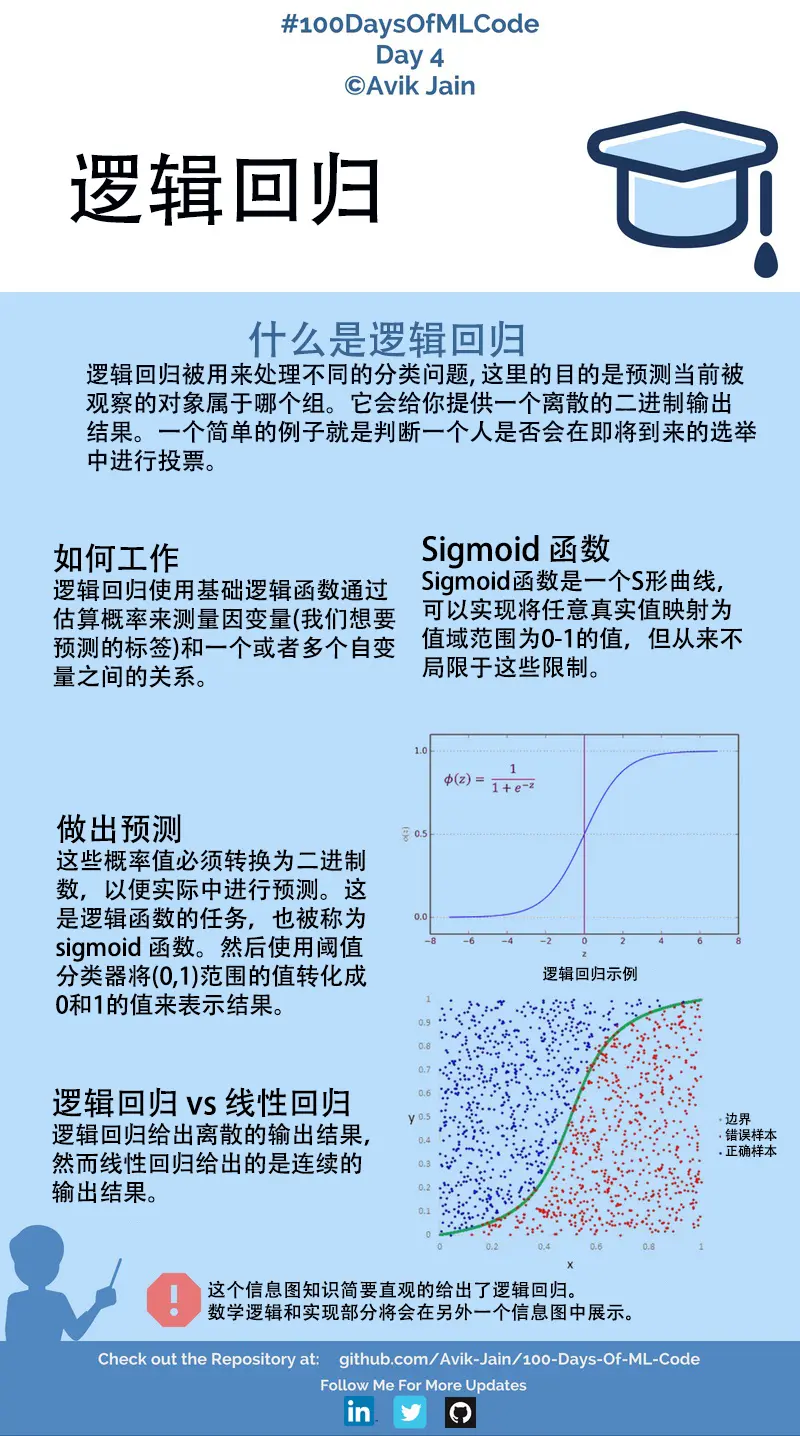 今天我深入研究了逻辑回归到底是什么,以及它背后的数学是什么。学习了如何计算代价函数,以及如何使用梯度下降法来将代价函数降低到最小。 由于时间关系,我将隔天发布信息图。如果有人在机器学习领域有一定经验,并愿意帮我编写代码文档,也了解github的Markdown语法,请在领英联系我。