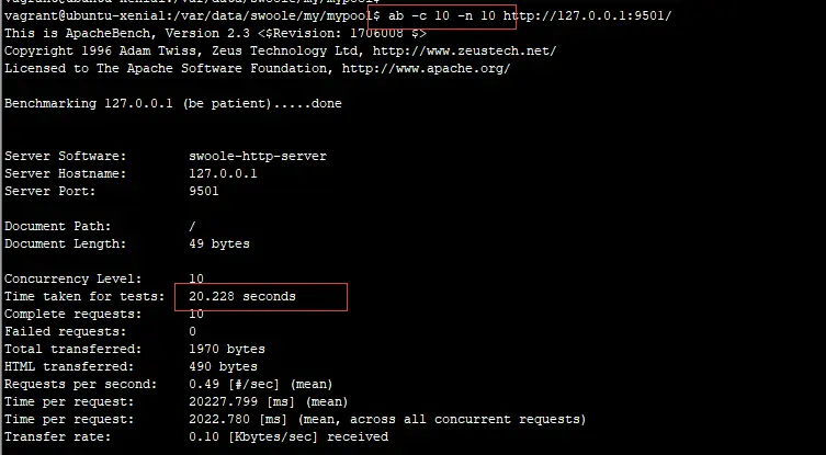 ab -c 10 -n 10运行的结果,单个worker处理,select sleep(2) 查询睡眠2s,协程客户端方式总共运行时间为2s多。结果如下: