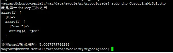 #1处代码,如果timeout配了4s查询超时,而第一条查询select sleep(5)阻塞后,协程切换到下一条sql的执行,其实$db并不能执行成功,因为用一个连接,同一个协程中,其实执行是同步的,所以此时第二条查询在等待4s超时后,没获取到db的连接执行,就会执行失败。而如果第一条查询执行的时间少于这个timeout,那么会执行查询成功。猜猜上面执行用时多少?结果如下: