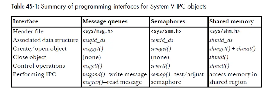 ipc_perm的子结构struct ipc_perm{ key_t __key; // get 时传的ket,SUSv3要求除了__key, __seq外其它字段都要具备 uid_t uid; // owner user id gid_t gid; // owner group id uid_t cuid, //creator user id 不可修改 gid_t cgit; // creator group id 不可修改 unsigned short mode; // 权限,9位,和文件权限类似,但对于IPC只有读写权限有意义 unsigned short __seq; }- IPC对象上进程权限分配的规则,类似文件系统(区别在文件是文件系统用户ID(一般也等于euid)):