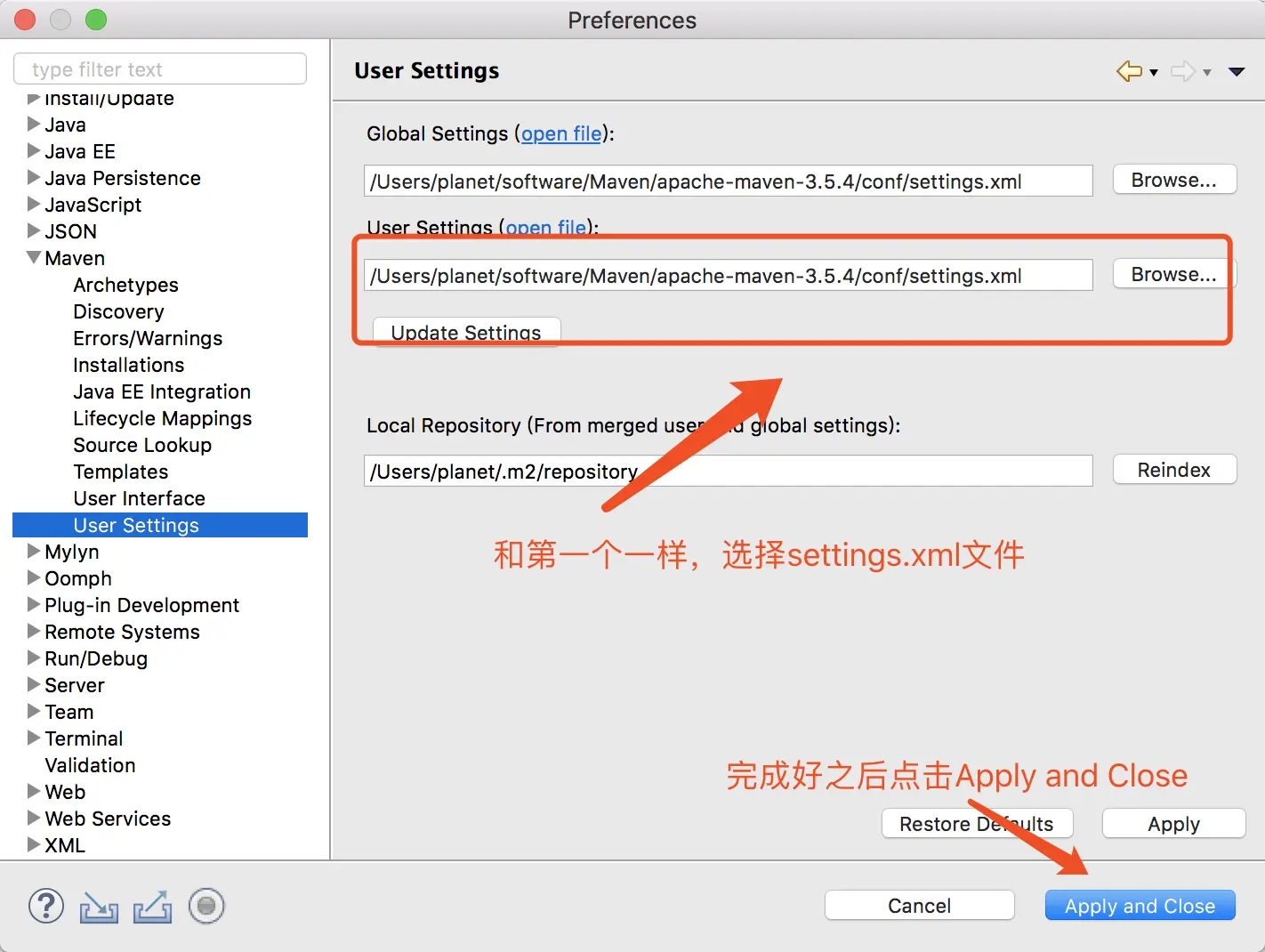 - 点击Maven下面的User Settings,Global Settings和User Settings都选择Maven根目录下面conf文件夹下的settings.xml文件,点击Apply and Close 关闭即可!