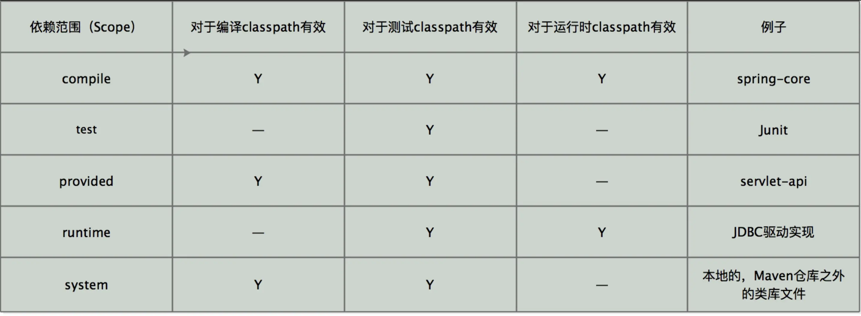 上述除import以外的各种依赖范围与三种classpath的关系如下: