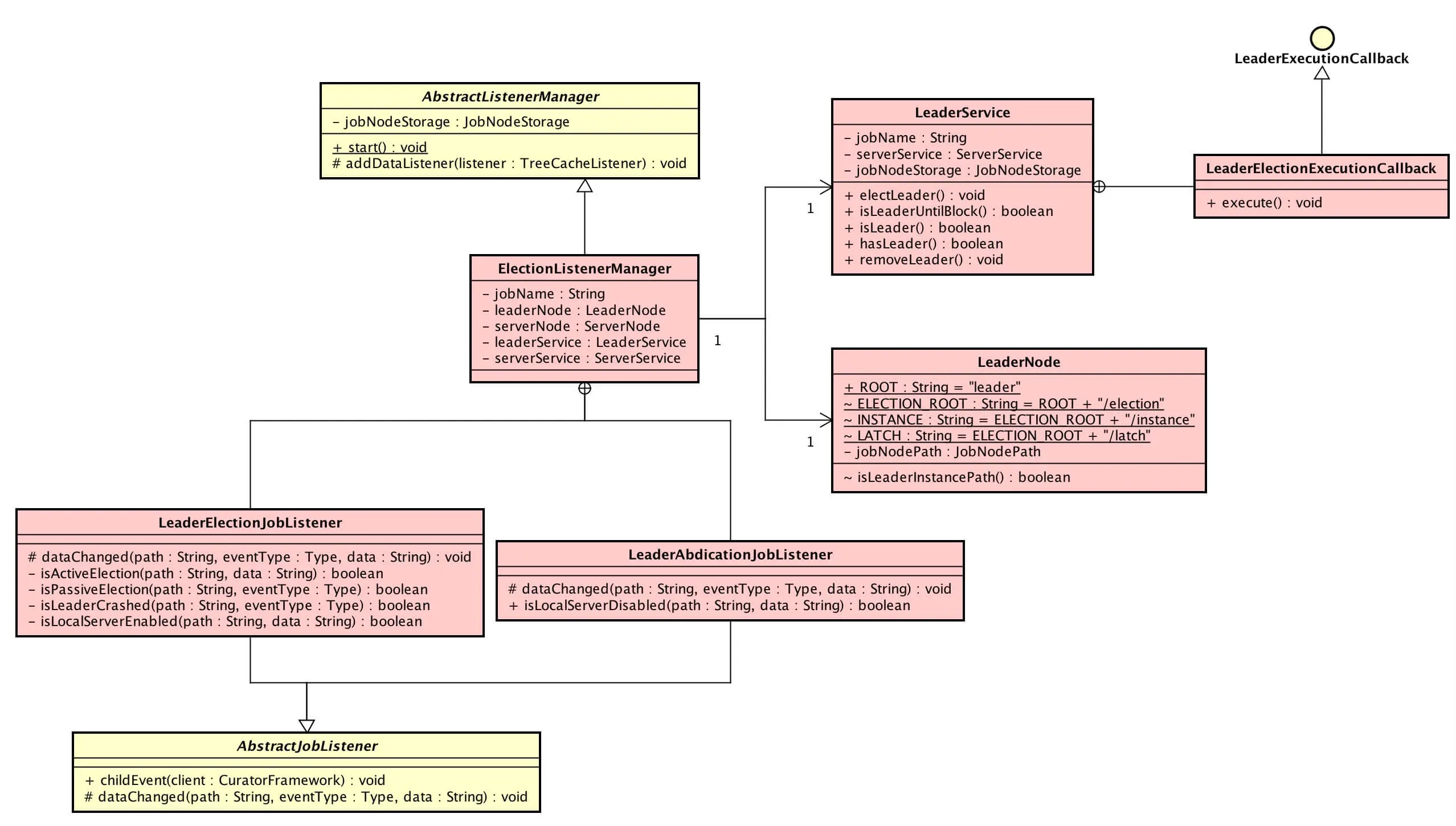 LeaderElectionExecutionCallback#execute()方法执行主节点设置。Curator LeaderLatch 在《Elastic-Job-Lite 源码分析 —— 注册中心》「3.1 在主节点执行操作」有详细解析。 -