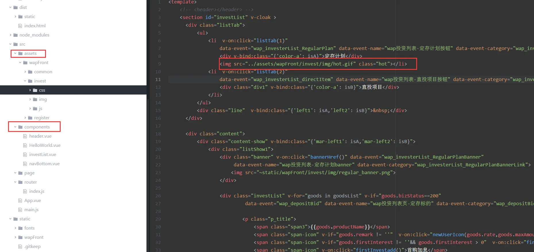 3.assets与components同级 components下的.vue引用静态文件时,相对路径为 ../assets/wapFront