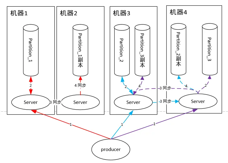 如上图,我们省略了不同的queue,假设集群上只有一个queue(Kafka中叫Topic)。每个生产者随机把消息发送到主分片上,之后主分片再同步给副分片。