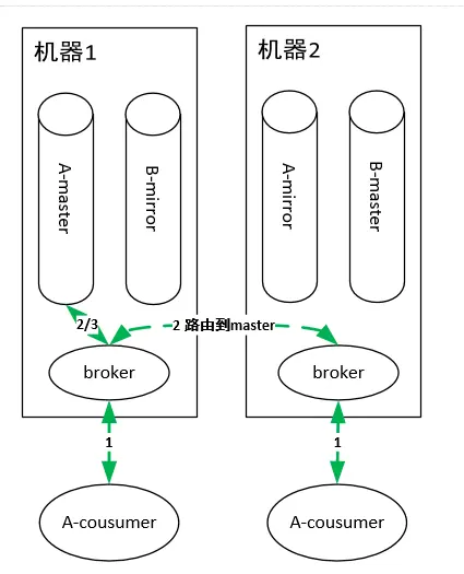 如上图有两个consumer消费队列A,这两个consumer连在了集群的不同机器上。RabbitMQ集群中的任何一个节点都拥有集群上所有队列的元信息,所以连接到集群中的任何一个节点都可以,主要区别在于有的consumer连在master queue所在节点,有的连在非master queue节点上。