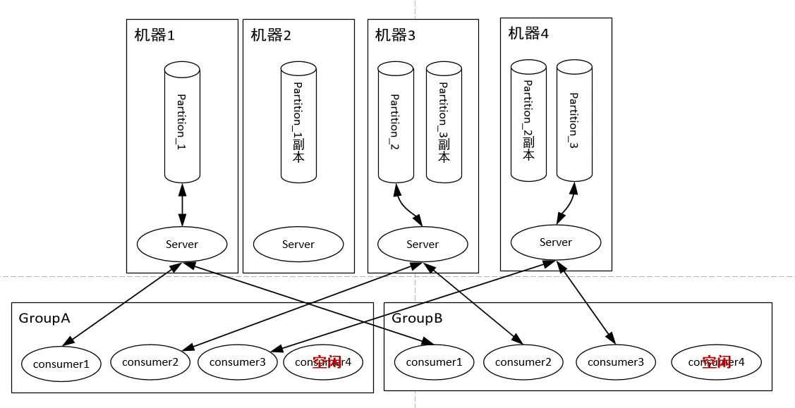 队列读取的时候虚拟出一个Group的概念,一个Topic内部的消息,只会路由到同Group内的一个consumer上,同一个Group中的consumer消费的消息是不一样的;Group之间共享一个Topic,看起来就是一个队列的多个拷贝。所以,为了达到多个Group共享一个Topic数据,Kafka并不会像RabbitMQ那样消息消费完毕立马删除,而是必须在后台配置保存日期,即只保存最近一段时间的消息,超过这个时间的消息就会从磁盘删除,这样就保证了在一个时间段内,Topic数据对所有Group可见(这个特性使得Kafka非常适合做一个公司的数据总线)。队列读同样是读主分片,并且为了优化性能,消费者与主分片有一一的对应关系,如果消费者数目大于分片数,则存在某些消费者得不到消息。