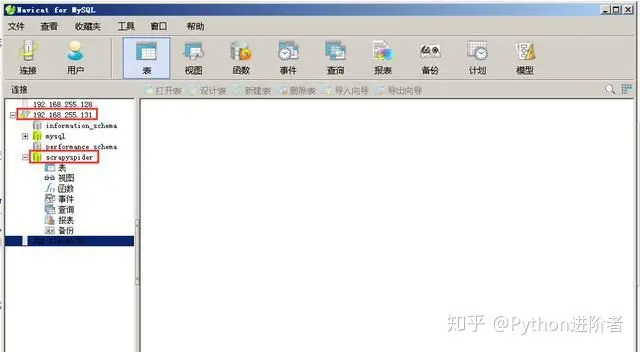 5、之后可以看到scrapyspider数据库创建成功,点击scrapyspider数据库,可以看到此时尚未创建任何的表。