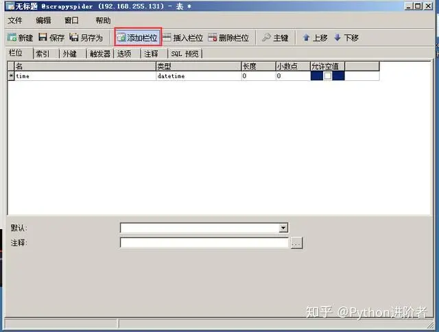 8、下图中,作为演示。添加了time、name和id三个字段,并将id设置为主键,如下图所示。