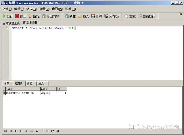 13、在查询窗口中输入SQL语句进行搜索,如下图所示,试图查询article表中的数据。SQL语句写完之后,点击“运行”选项卡,之后查询到的结果将会在同一个窗口下进行显示,如下图所示。