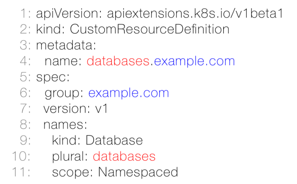值得注意的是resource 资源(在本例中是databases)和group群组(本例中是example.com)必须与metadata.name 字段匹配(本例为第四行databases.example.com)。