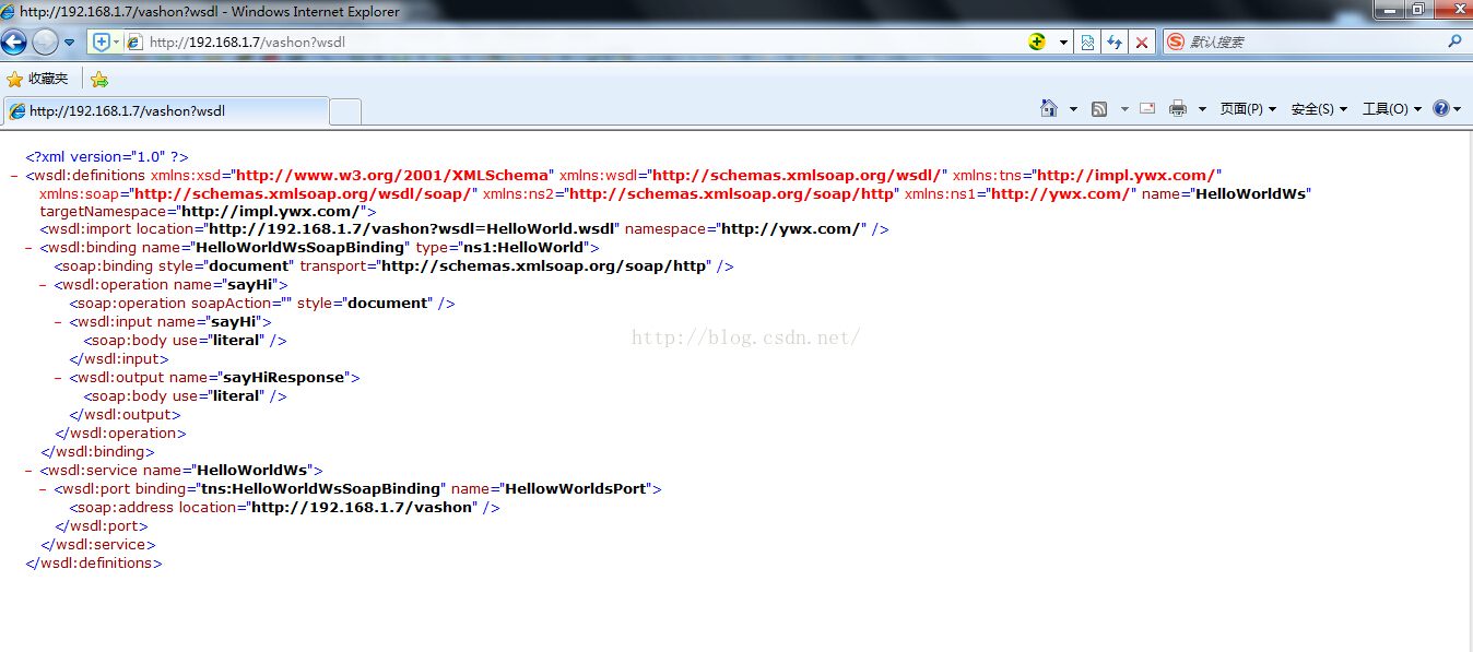 public class ServiceMain { public static void main(String args[]){ HelloWorld hw = new HellowWorlds(); //调用Endpoint的publish方法发布Web Service Endpoint.publish("192.168.1.7/vashon", hw); System.out.println("Web Service暴露成功!"); } } 然后运行浏览器,输入:http://192.168.1.7/vashon?wsdl 查看结果,如果成功生成如下wsdl文档则表示Web Service暴露成功。