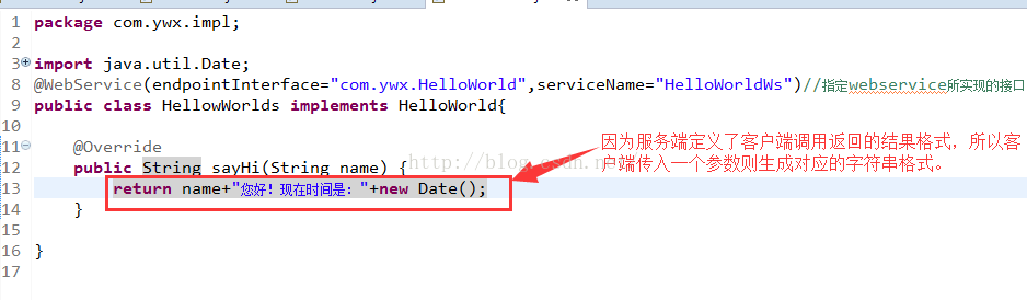 import com.ywx.HelloWorld; @WebService(endpointInterface="com.ywx.HelloWorld",serviceName="HelloWorldWs")//指定webservice所实现的接口以及服务名称 public class HellowWorlds implements HelloWorld{