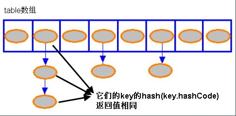 根据上面 put 方法的源代码可以看出,当程序试图将一个 key-value 对放入 HashMap 中时,程序首先根据该 key 的 hashCode() 返回值决定该 Entry 的存储位置:如果两个 Entry 的 key 的 hashCode() 返回值相同,那它们的存储位置相同。如果这两个 Entry 的 key 通过 equals 比较返回 true,新添加 Entry 的 value 将覆盖集合中原有 Entry 的 value,但 key 不会覆盖。如果这两个 Entry 的 key 通过 equals 比较返回 false,新添加的 Entry 将与集合中原有 Entry 形成 Entry 链,而且新添加的 Entry 位于 Entry 链的头部——具体说明继续看 addEntry() 方法的说明。