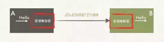 这就是对称加密算法,其中图中的密钥S同时扮演加密和解密的角色。具体细节不是本文范畴。