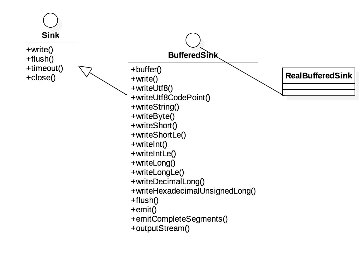 这段代码演示了如何写入一个文本到文件。其先构建一个Sink,类似于Java的OutputStream,再构建一个BufferedSink,类似于Java的 BufferedOutputStream。然后就可以写入文本了。同样,是不是很简单呢。也先来看看写入相关的类图。